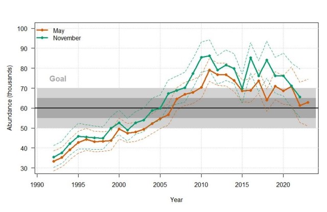 Modell-estimater av bestandsstørrelse for den Svalbard-hekkende kortnebbgåsbestanden i mai og november. Den svarte linjen viser det vedtatte bestandsmålet. Det mørkegrå feltet angir interessenters aksept for bestandsstørrelse, mens det lysegrå feltet viser når det er mindre enn halvparten så mye aksept for bestandsnivået. Kilde: Jensen, G.H., Johnson, F.A., Baveco, H., Koffijberg, K., Goedhart, P.W. and Madsen, J. (2023) Population Status and Assessment Report 2023. EGMP Technical Report No. 21 Bonn, Germany