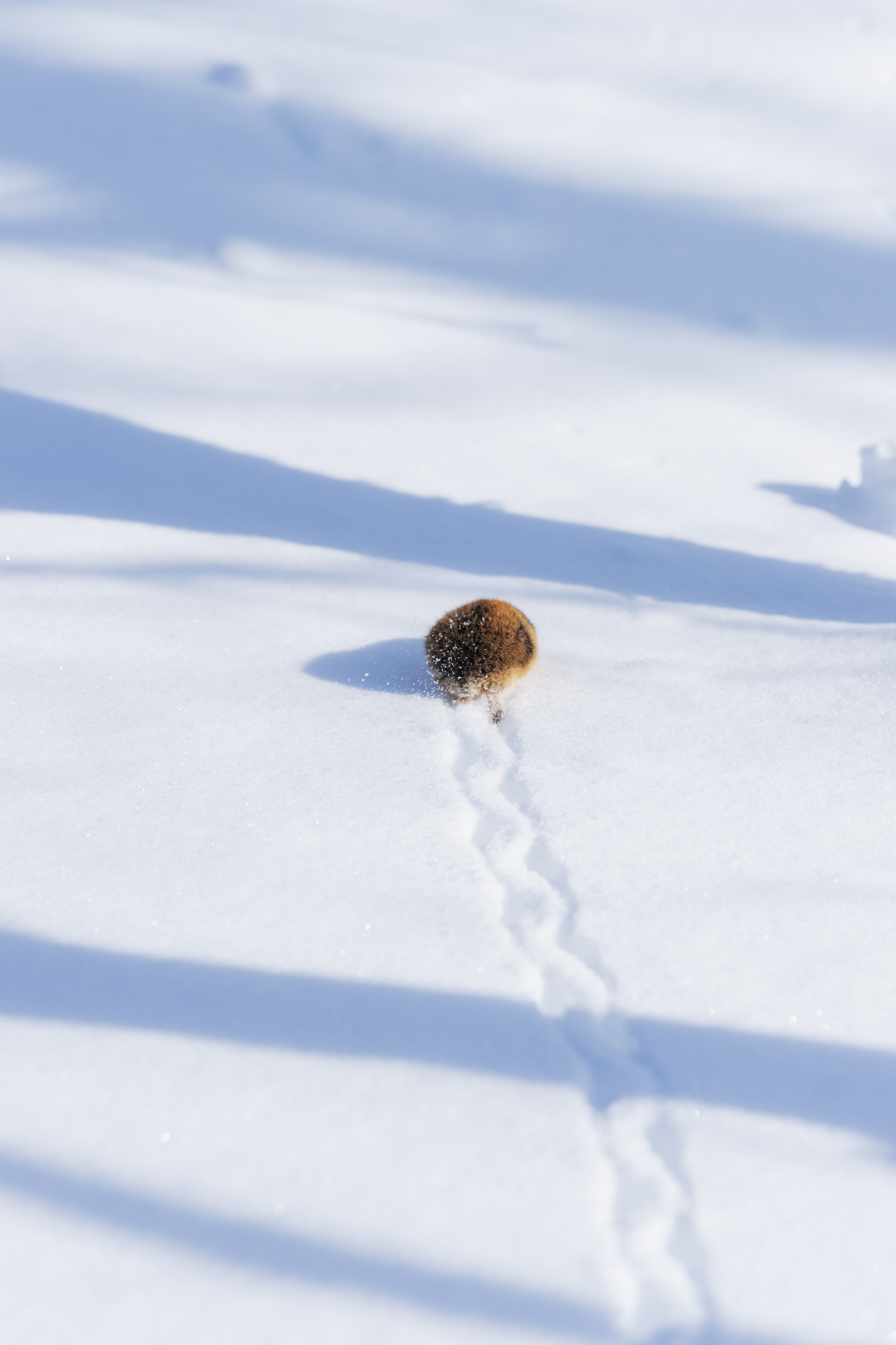 Om vinteren lever lemen i tørre områder, gjerne under et tykt dekke av snø, hvor den spiser mose og musøre. Etter store lemenår, er beiteeffekten så omfattende at den kan ses på satelittbilder. Lemen bruker alltid gang eller trav, og man kan ikke se spor etter halen. Skrittlengden er 10-15 cm. Foto: Magnus Ström