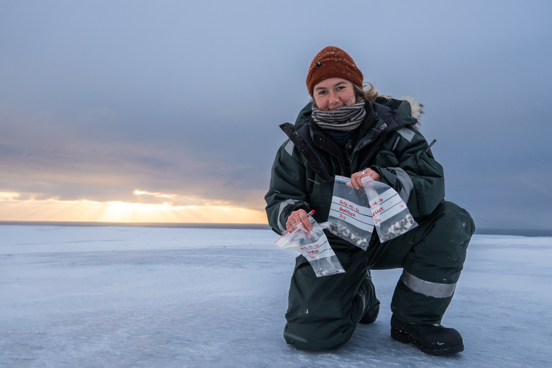 Avføringa kan gi svar på hvordan reinsdyra tilpasser seg områder med bakkeis. I noen områder kan kystreinen til en viss grad kompensere for bakkeis, ved å spise tang og tare som har blåst på land. Her er Larissa Beumer (UNIS) med avføringsprøver, som brukes for å studere dietten til dyra. Foto: Trine Lise Sviggum Helgerud, Norsk Polarinstitutt