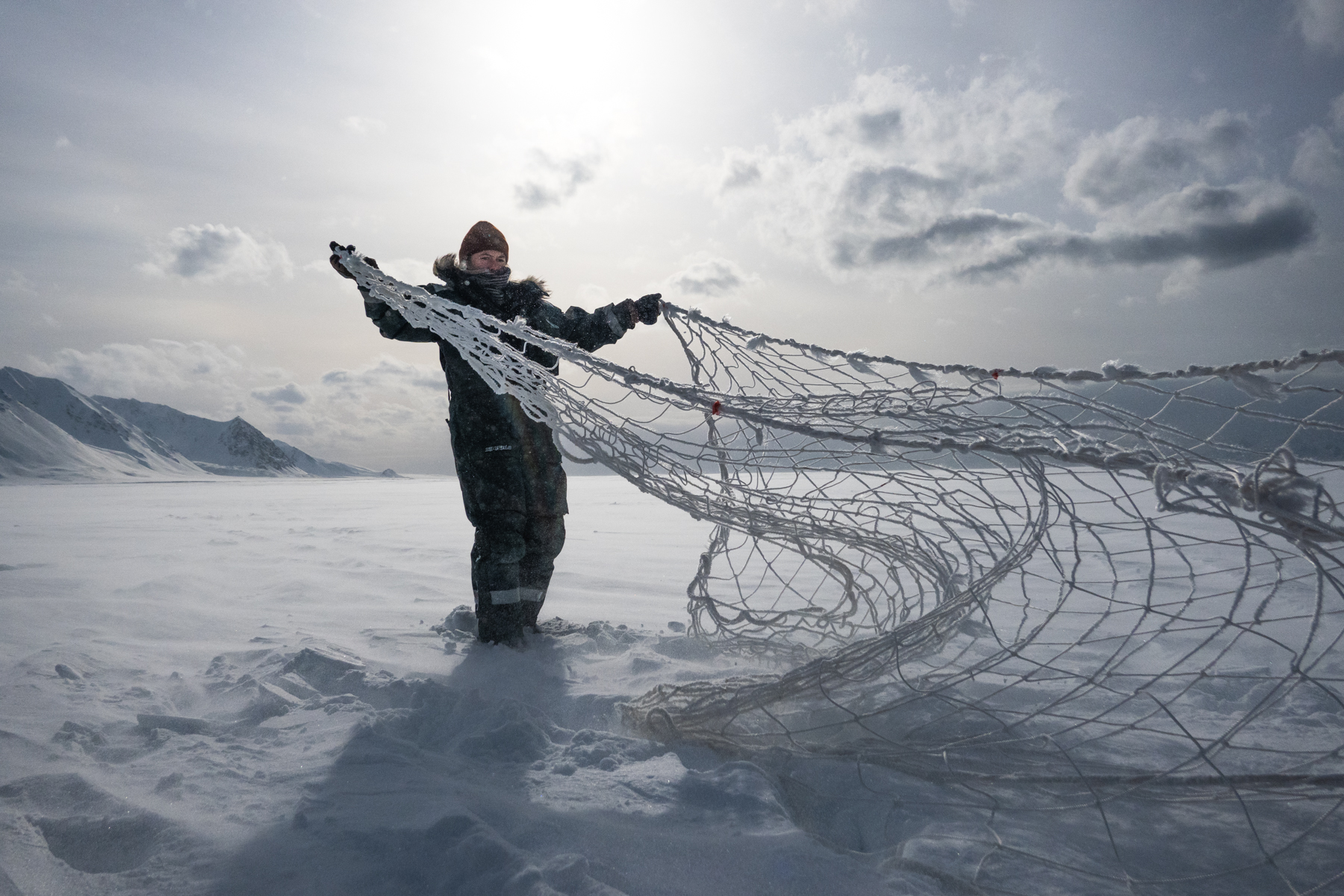 Forskningsfangsten skjer med nett og foregår i april hvert år etter tillatelse fra Mattilsynet og Sysselmesteren. Dyra fanges på tundraen, og forskerne gjør ulike målinger, før de slippes etter kort tid. Larissa Beumer (UNIS) klargjør nettet. Foto: Trine Lise Sviggum Helgerud, Norsk Polarinstitutt