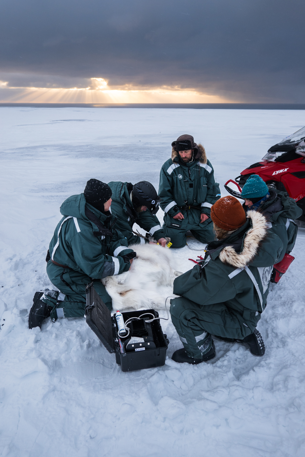 I vind og snøfokk påfører forsker Åshild Ønvik Pedersen ultralydgelé på proben. Feltlaget på Brøggerhalvøya har fanget ei simle og skal sjekke om hun er drektig. Hun studerer bildet på det bærbare ultralydapparatet og holder proben på simlas mage.