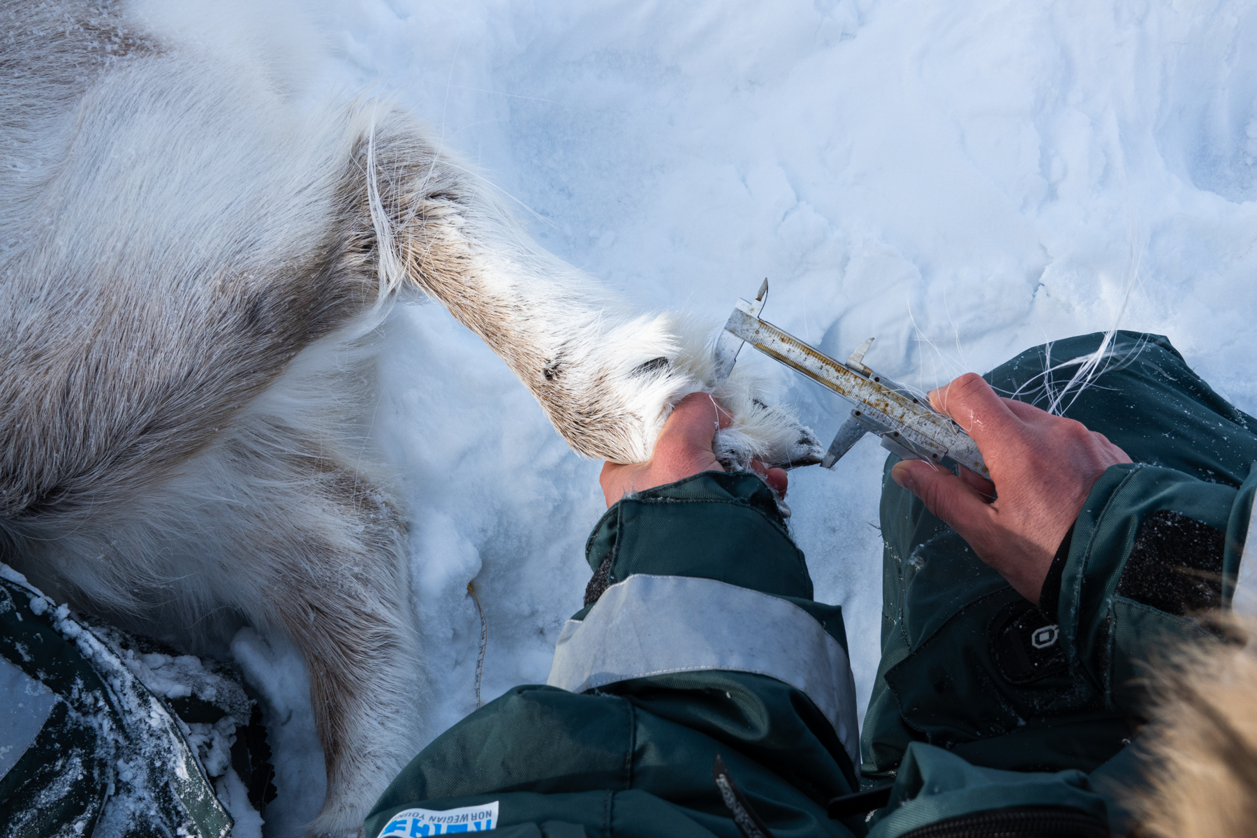 Klauven er et viktig redskap for å grave seg igjennom snø og islag på bakken. Forskerne måler størrelsen for å studere variasjon mellom individer og bestander, og til å studere evolusjonen som har ført til underarten vi i dag kaller svalbardrein. Foto: Trine Lise Sviggum Helgerud, Norsk Polarinstitutt