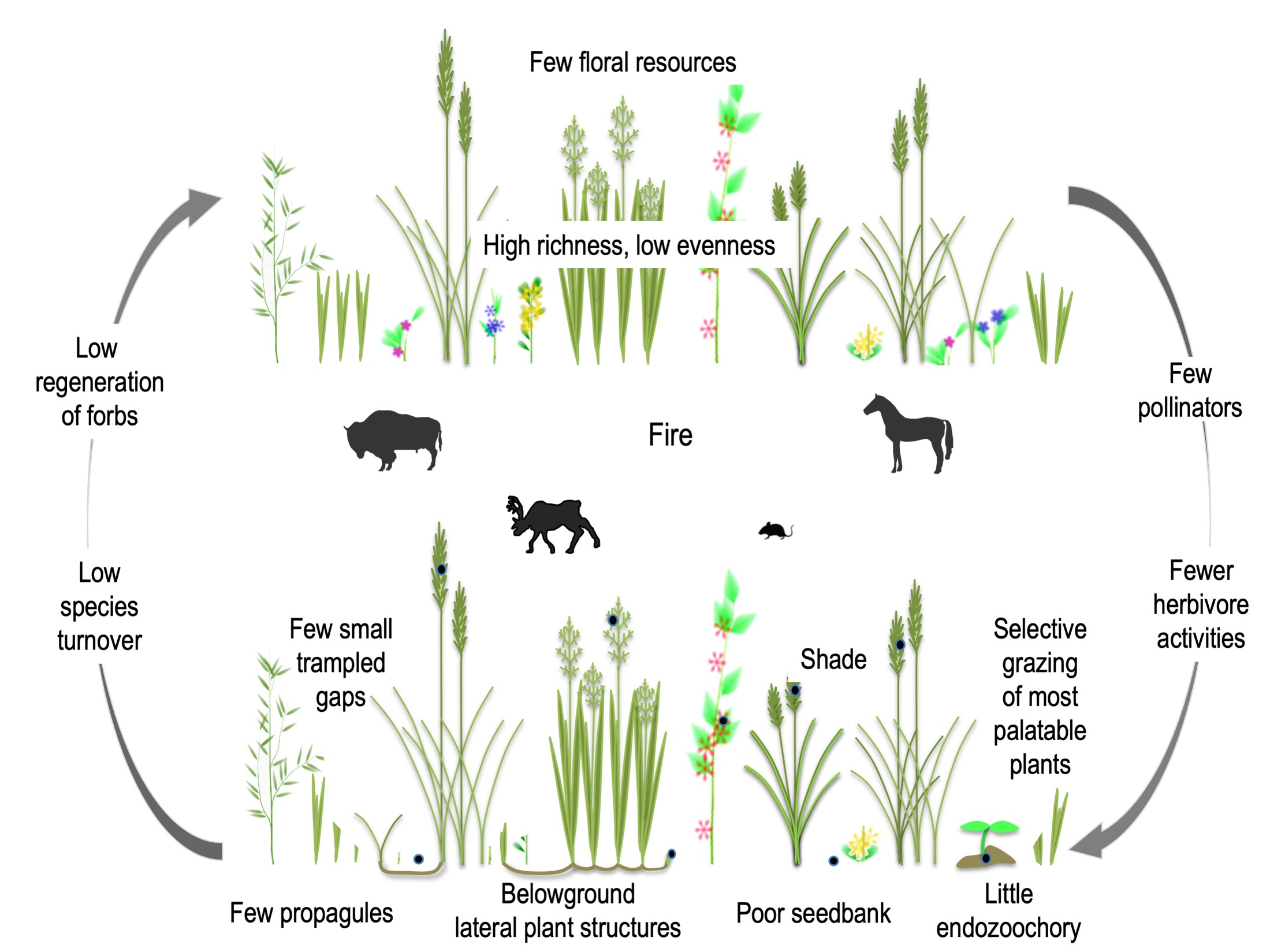 Weak plant–herbivore feedbacks in contemporary grasslands. Forb populations are assumed to be small and fragmentary, as they are part of the subordinate or transient species pool under strong competition from dominant species of caespitose and rhizomatous graminoids (or the occasional dominant forb). Dense, shading vegetation reduces light resources, while lateral spread of rhizomes and roots reduces belowground regeneration opportunities. Seed germination and bud sprouting (solid black circles) are reduced and the capacity of the grassland to regenerate favors dominant plant species.