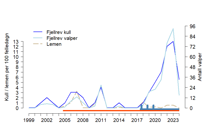 Antall aktive hi og antall fjellrevvalper registrert på Varangerhalvøya er vist sammen med lemendynamikken. Den røde linjen viser tidspunktet for når vi startet utskyting av rødrev somet forvaltningstiltak og de blå boksene viser de tre årene hvor vi har satt ut fjellrevvalper fra avlstasjonen på Oppdal i samarbeid med NINA.