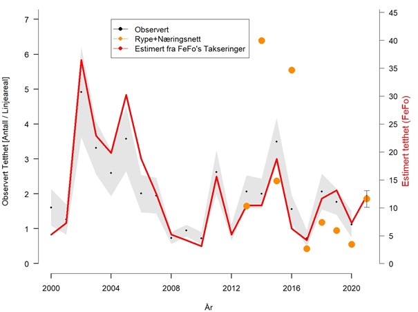 FeFo publiserte nylig resultatene fra årets taksering i Finnmark fra Hønsefuglportalen (figur 3). Det er gledelig å se at våre prediksjoner samlet sett samsvarer godt med resultatet av takseringene i den forstand at endringen fra år-til-år er tilsvarende både for de predikerte fra modellen og observerte/estimerte tetthetene basert på takseringene – særlig over de siste 5 årene.
