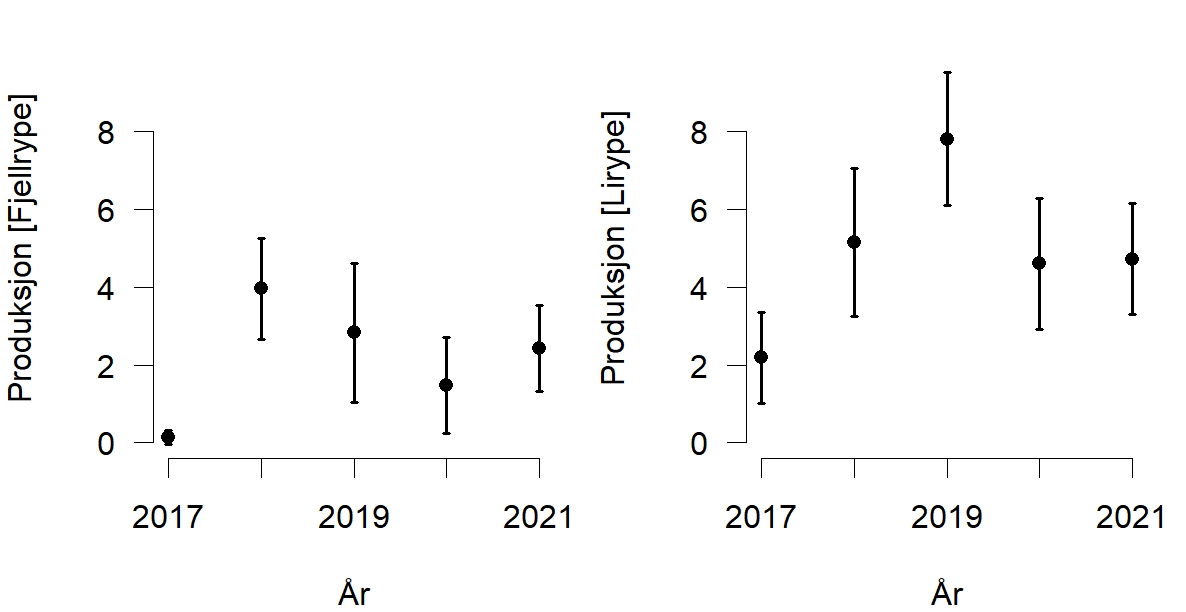 Figur 4. Estimering av årets produksjon (Kyllinger per høne) for både lirype og fjellrype i ett område vest på Varangerhalvøya (Bergebydalen og omegn). Figuren viser en oppgang i produksjonen av fjellrype, mens ingen endring for lirype, sammenlignet med fjoråret.