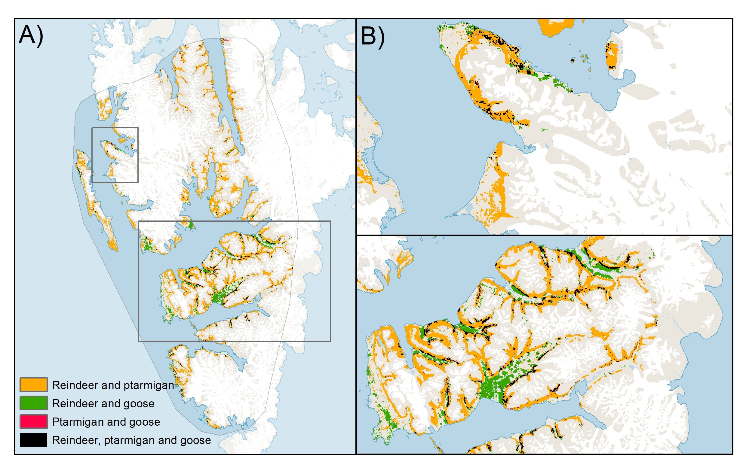 Vi fant overraskende lav overlapp i habitat egnethet mellom de tre beitedyrene. Selv om 9-45% av vegetert areal på Svalbard er egnet som habitat for artene hver for seg, var kun 1-2% av det vegeterte arealet egnet for alle tre artene kombinert. Høyeste andel delt egnet habitat ble funnet for svalbardrype og svalbardrein (24%) mens tilsvarende tall for gjess og rype var kun 2 %. Overlapp for all tre arter ble funnet i hei-vegetasjon, mens høyest andel egnet, delt habitat for kortnebbgås og rein var i mose tundra og mose tundra under fuglefjell i lavere deler av terrenget (0-150 moh, 6%). Resultatene som ble bekreftet av skittelling som indikator for bruk av habitatene, viser at hei og mose tundra er viktige habitat for alle disse beitedyrene på Svalbard.