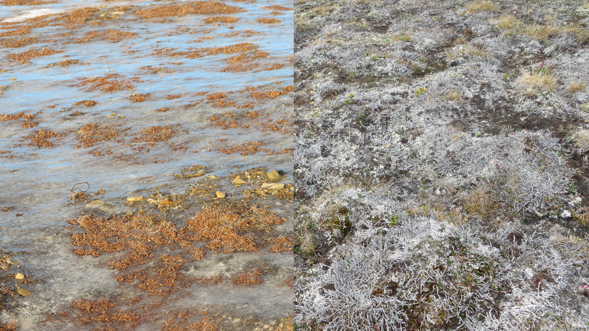 Planter kan bli skadet av innkapsling i is om vinteren, noe som også kan detekteres fra satellitt-bilder i høyereliggende deler av landskapet. Foto: Virve Ravolainen / NP og Åshild Ønvik Pedersen / NP