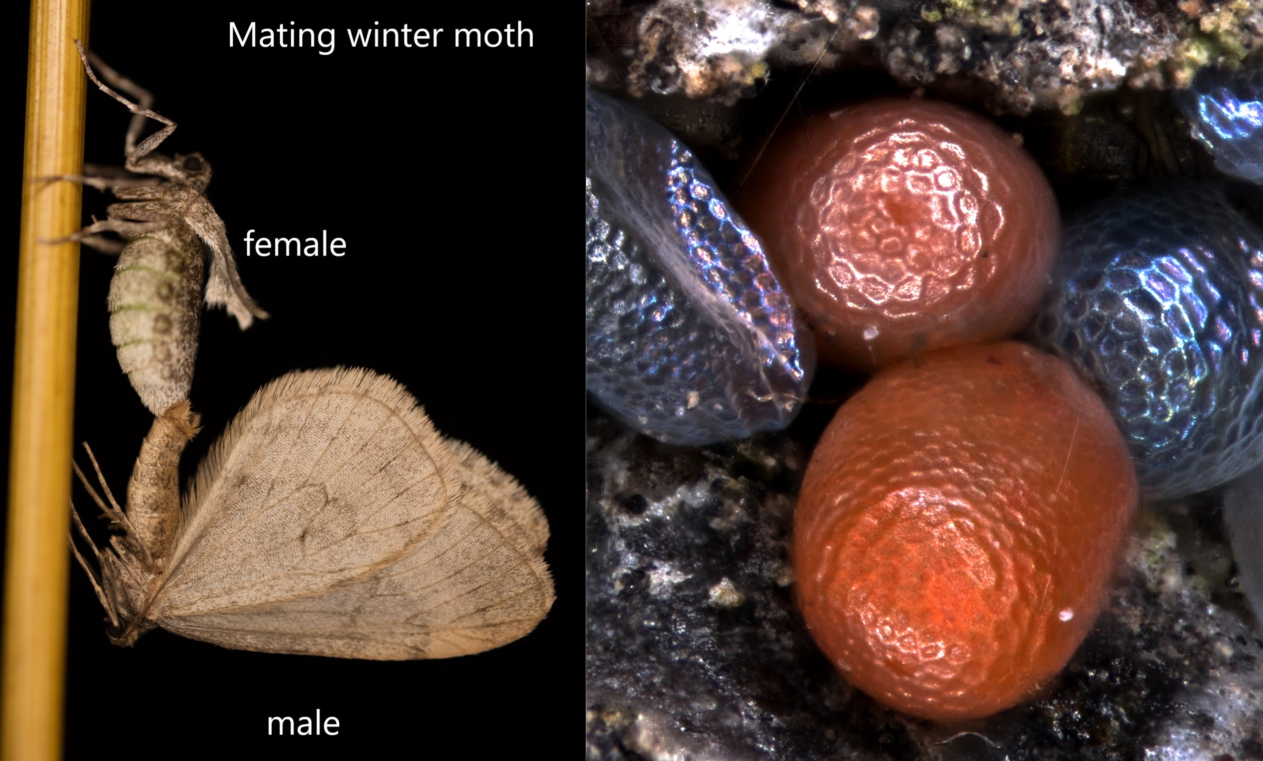 Venstre: Parring hos brun høstmåler. Foto: Jon Aars. Høyre: Måler egg. Foto: Malin Ek.