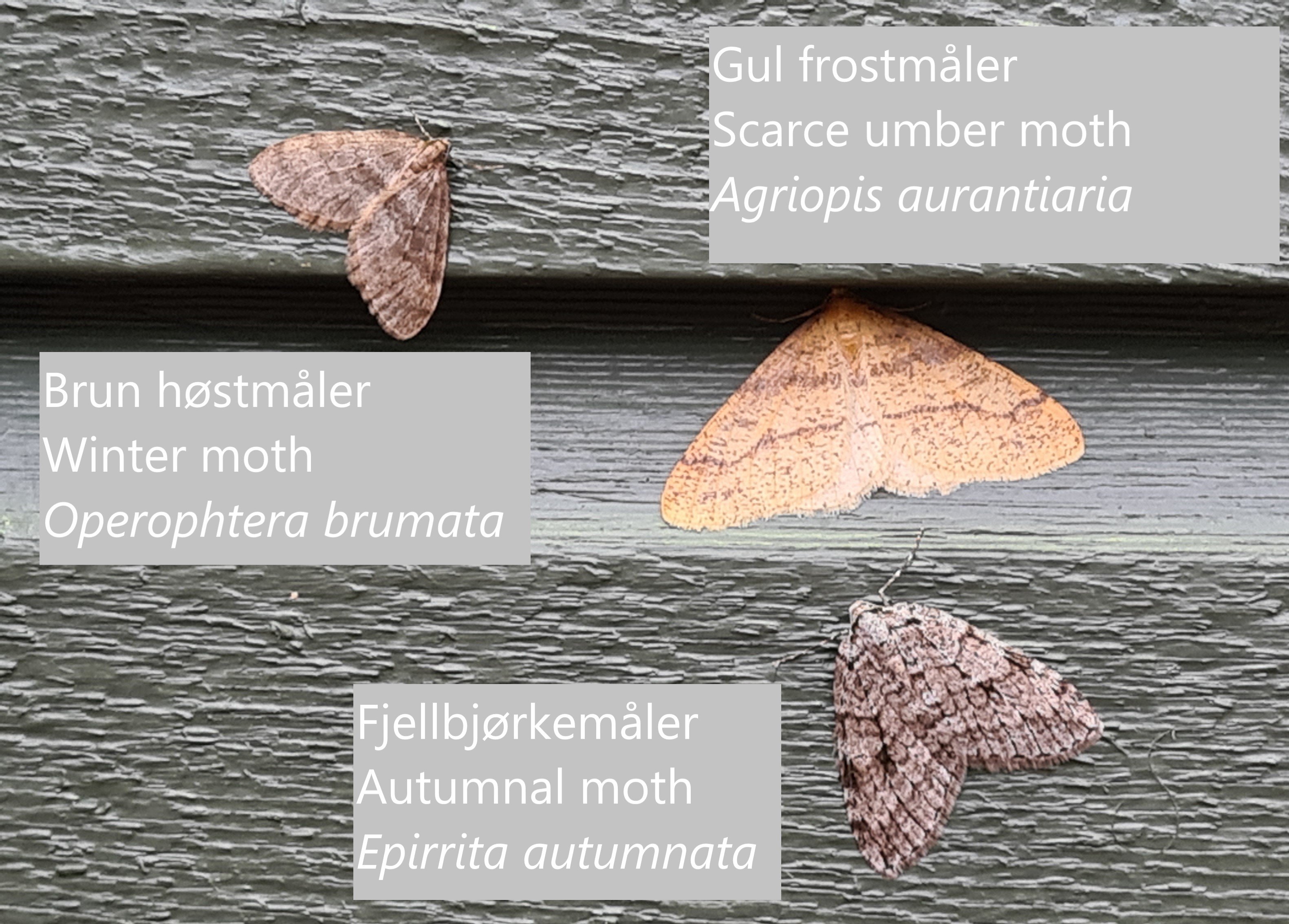 De voksne målerne søker mot kraftige lys om kvelden, så skru på utelyset og se opp! Akkurat nå er det mulig å se alle tre arter.