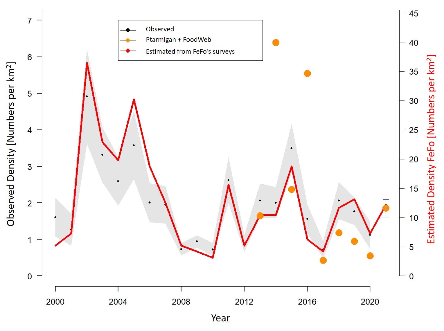 Figure 3. The figure show the estimated density of the willow ptarmigan population in Finnmark in the period 2000 - 2021 (red line, data from FeFo) compared with the predictions from COAT's food web model in the last 9 years (orange dots). Note that our model predicts the average observed number of ptarmigan per km2, while the assessment result (red line) is given as the estimated number of ptarmigan per km2 from a model that corrects for detectability (i.e. a distance model). More detailed data on the estimated production and density of willow ptarmigan in different parts of Finnmark can be found on FeFo's website.