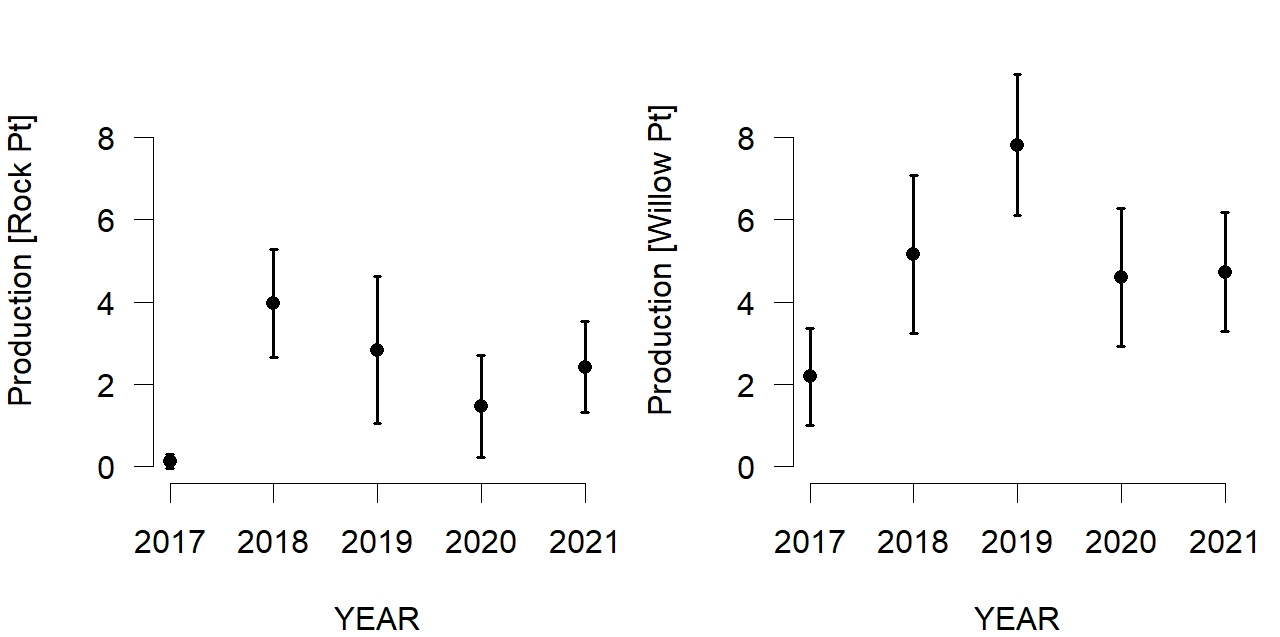 Figure 4. Estimation of chick production (Chicks per female) for both willow and rock ptarmigan in one area west on the Varanger Peninsula (Bergebydalen and surroundings). The figure shows an increase in the production of rock ptarmigan, while no change for willow ptarmigan, compared with last year.