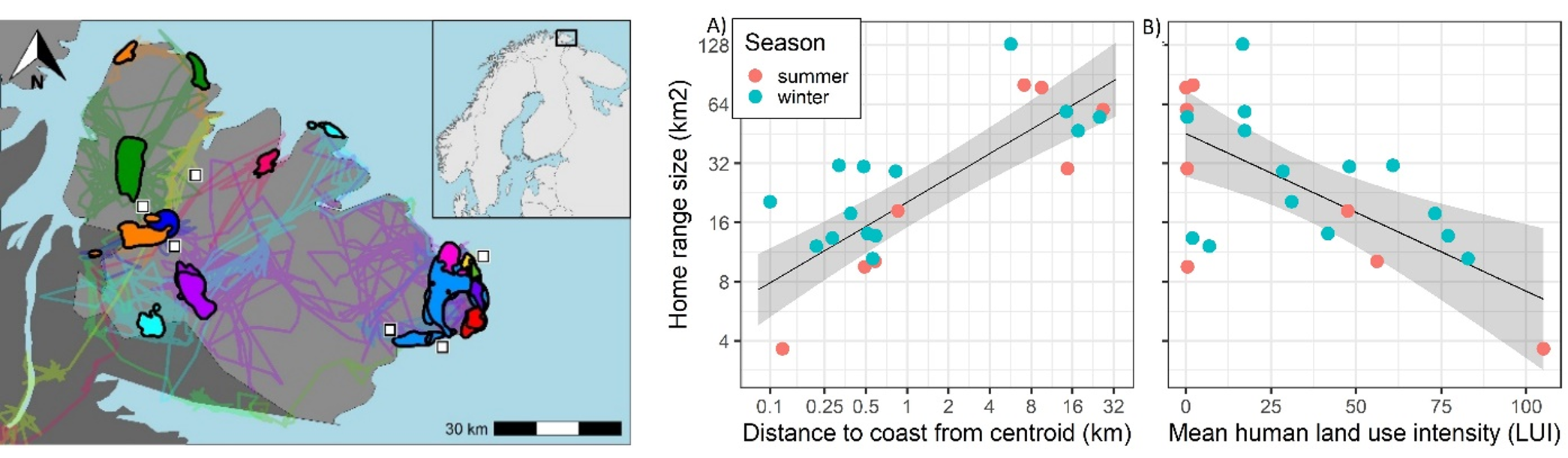 The home ranges of 14 red foxes tracked on Varanger Peninsula were found to be smaller at closer distances to the coastline and smaller at higher human land use intensities. Within these individual home ranges, foxes were also found to prefer habitats close to the coast and prefer habitats with higher human land use intensities. These results suggest that the marine coastline and human land use provide important food resources to red foxes on Varanger.