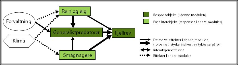 Figur: Forventede effekter av klimaforandringene og forvaltningstiltak på fjellrev i Varanger. Varmere vintre kommer å ha en indirekte negativ påvirkning på fjellrev på to måter, som muligens interagerer: Gjennom lavere tilgjengelighet på lemen som viktig byttedyr, og gjennom økende bestander av generalist-predatorer (særlig rødrev) som blir begunstiget av økende forekomst av kadavere av elg og rein . Både elg, rein og rødrev er forvaltede bestander.