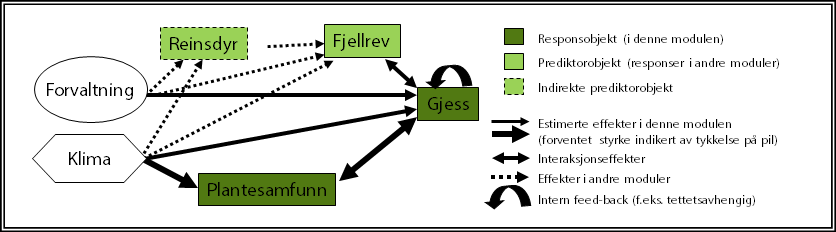 Forventede effekter at klima og forvaltning for gjessene på Svalbard. En tidligere vår, både direkte og indirekte, er forventet å ha den sterkeste klimapåvirkningen. En annen klimapåvirkning er predasjon forårsaket av fjellrev: klimaet påvirker fjellrevbestanden både direkte og indirekte via tilgangen til kadaver av Svalbardrein. Gjessenes forekomst forventes også å være påvirket av forvaltningen (både jakt og fredning).