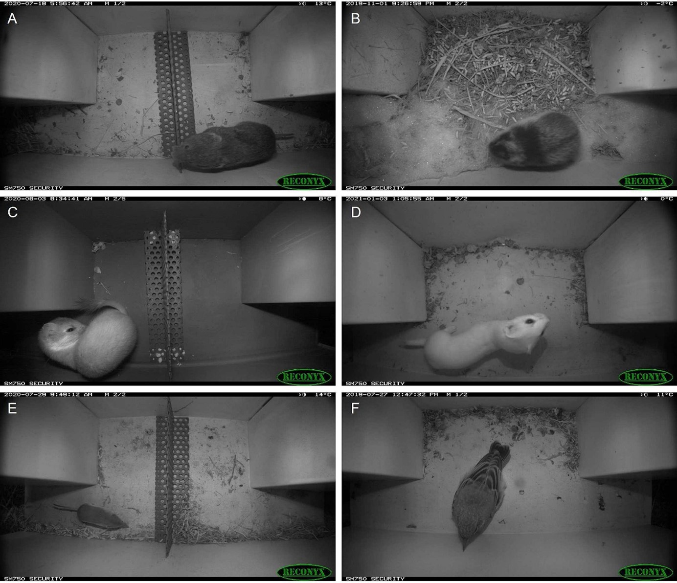 Figur 2: Eksempel bilder fra kamerafellene. A:gråsidemus. B: lemen. C: røyskatt. D: snømus, E: spissmuss, F: fugl. Legg merke til at det er en del variasjon i bakgrunnen og formen på dyrene på bildene selv om kameraoppsettet er ganske standardisert.