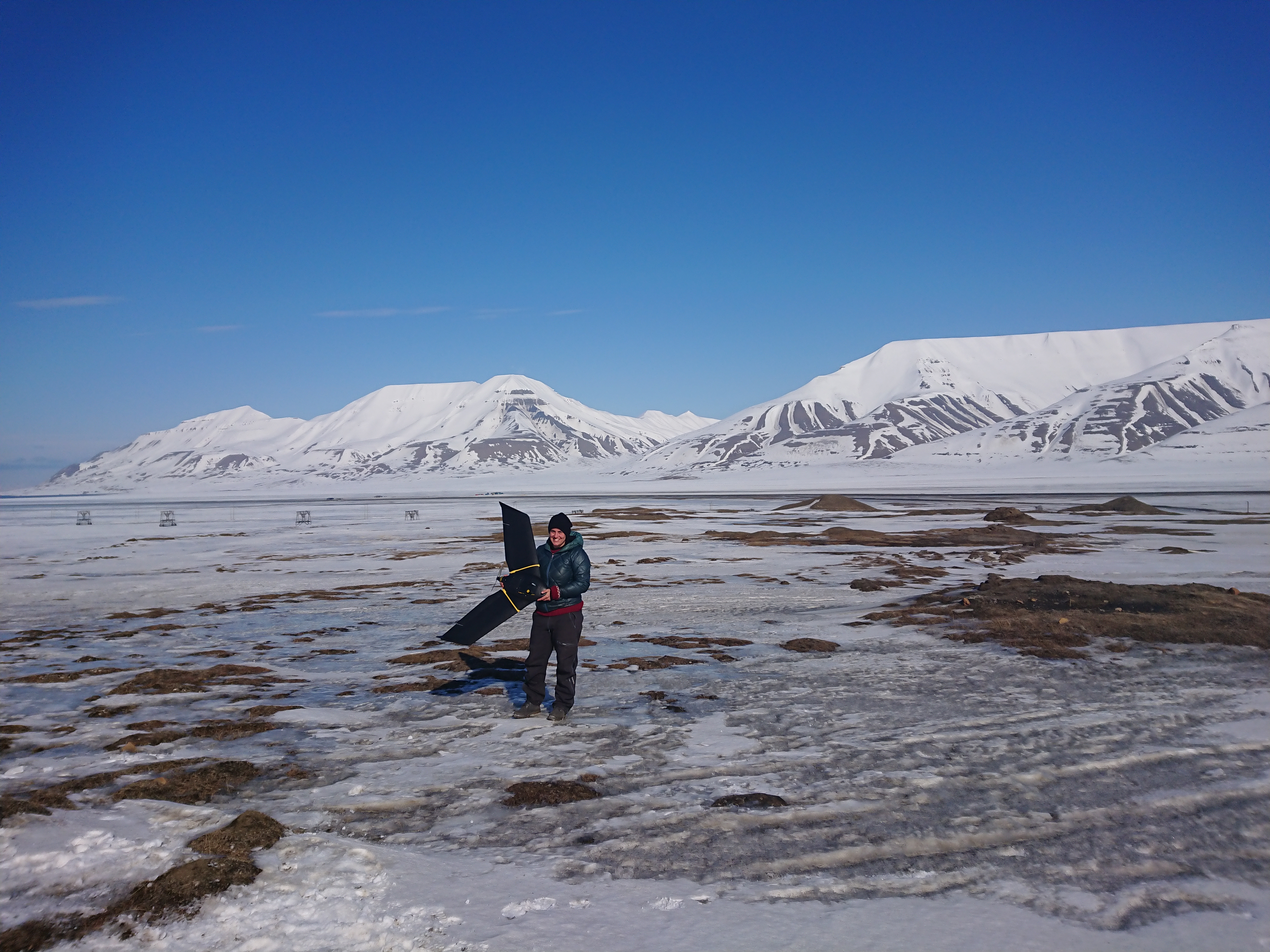 Ved hjelp av droner kan vi kartlegge snøsmeltingen på våren. I tillegg kan dronebildene brukes som bakkesannhet for å lage snøkart fra satellittbilder. Vi bruker en drone som tåler kjølig luft og varierte vindforhold, typisk for vårsesongen i arktiske strøk. Foto: Linda Ársælsdóttir.