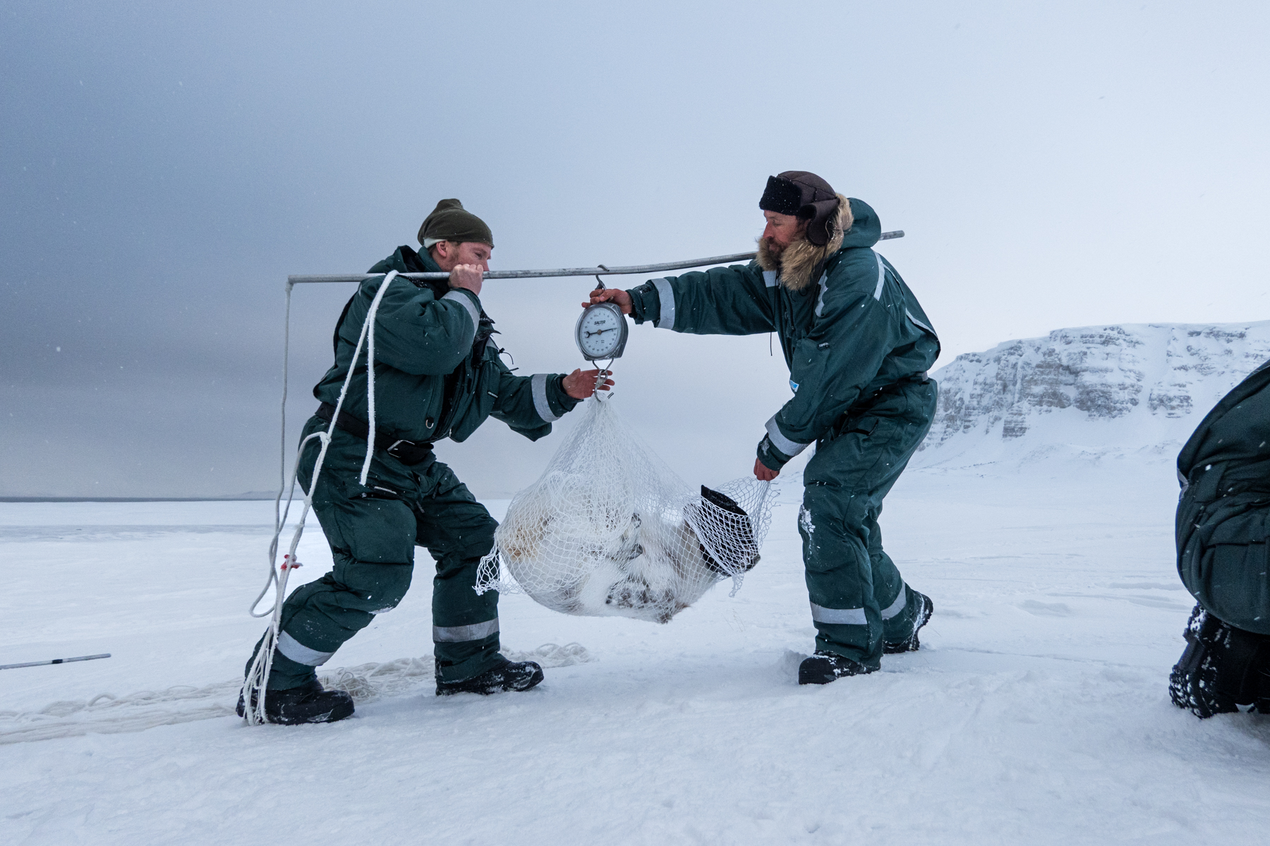 Over eller under 50 kilo? Terskelen for om det blir et godt år for reproduksjon eller ikke, ligger på 50 kilo. Hvis simlene veier med enn 50 kg i gjennomsnitt ser vi at det vanligvis er drektige og vil overleve vinteren i områdene rundt Longyearbyen. Foto: Trine Lise Sviggum Helgerud, Norsk Polarinstitutt
