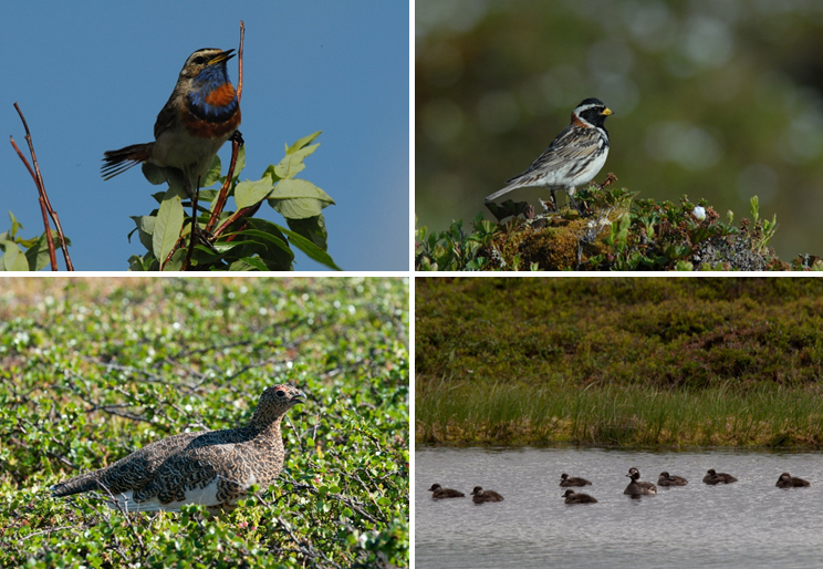 Four bird species nesting on tundra that have recently been placed on the Norwegian red list. Bluethroat (top left), Lapland longspur (top right), willow ptarmigan (bottom left) and a female long-tailed duck with chicks (bottom right). All photos were taken on the Varanger Peninsula. Photos: Geir Vie