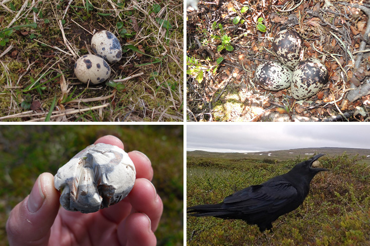 Experimental methods for studying nest predation. Top left: One of the experimental nests in the COAT study consisting of one quail egg and one plasticine egg. Top right: A natural shorebird nest (golden plover). Bottom left: A plasticine egg with the beak mark of a nest predator (most likely a raven). Bottom right: A raven robbing one experimental nest as revealed by a motion-sensitive trail camera. Photas: COAT.