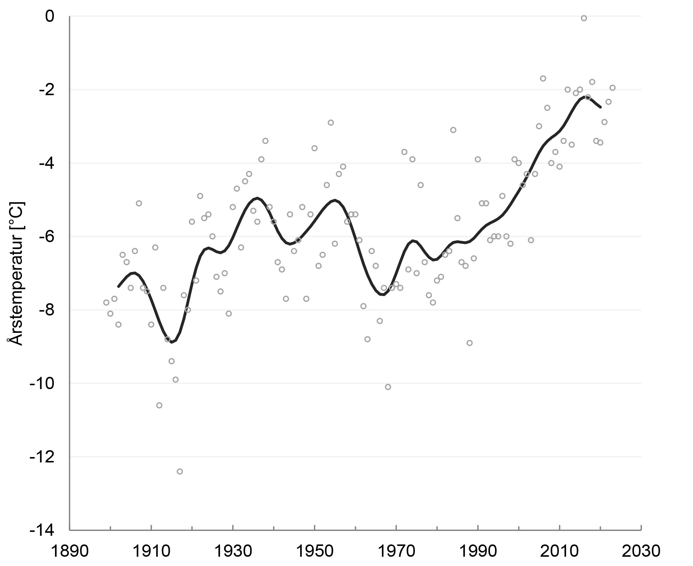 Figur 1. Årsmiddeltemperatur på Svalbard Lufthavn. Den tykke uthevede linjen viser filtrerte data som representerer langtidsvariasjoner på dekadeskala.