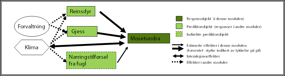 Den antatte samlede effekten av beitedyr og global oppvarming kan i mange tilfeller endre økosystemet fra et mosedominert plantesamfunn med kjølig jord til et gress-dominert plantesamfunn med et dypere aktivt jordlag og en raskere nedbryting av organisk materiale. I Svalbards kyststrøk kan gjødsling fra spesielt sjøfugl påvirke utviklingen av plantesamfunnene, og endringer i sjøfuglpopulasjonene kan påvirke denne utviklingen. Mosetundramodulen i COAT fokuserer på effekten av klima på mengde og kvalitet av karplanter, inkludert effekter på mosedybde og erosjon/åpne uvegeterte områder som følge av forstyrrelse.
