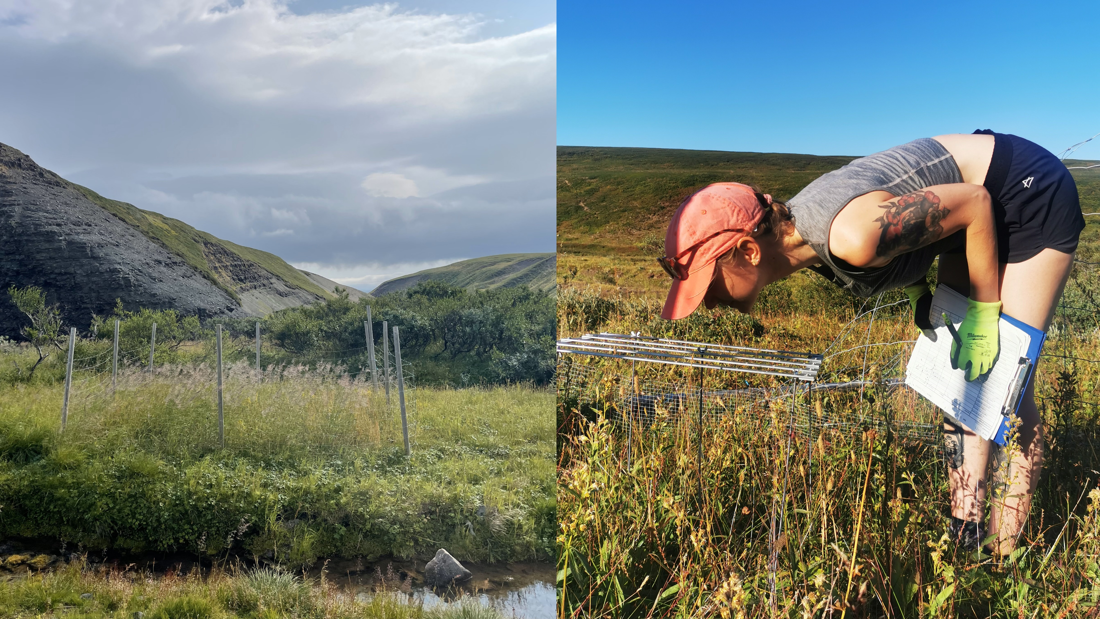 Bildet til venstre viser et av våre inngjerdede områder med frodig engvegetasjon, i kontrast til mer beitet engvegetasjon utenfor. Foto: Oline Eikeland. Bildet til høyre viser en feltarbeider fra COAT som samler inn data om biomasse. Foto: Ingrid G. Paulsen.