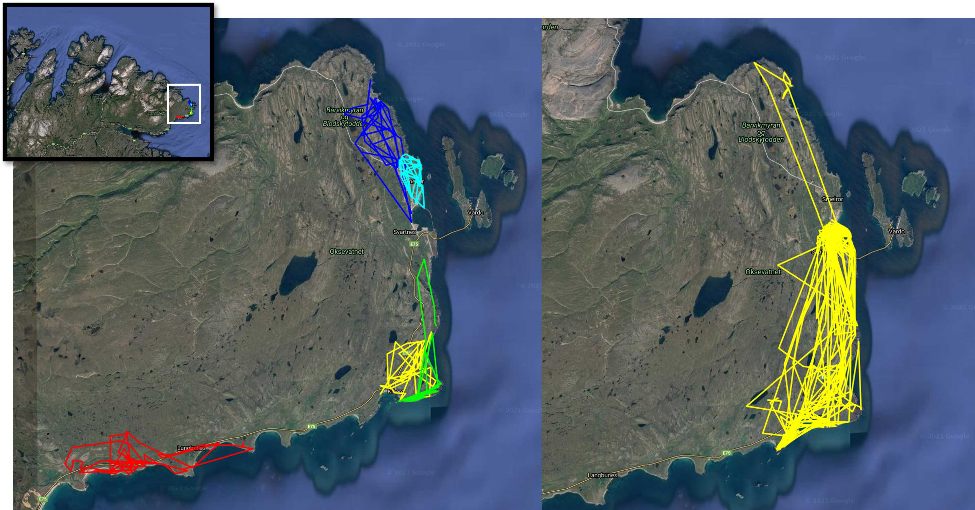 På kartet til venstre ser man sporene fra fem rødrever langs den lavarktiske kysten av Varangerhalvøya fra 17 til 23 november 2021. De blå og grønne sporene er fra tisper, mens de andre er fra hanner. På kartet til høyre ser man områdebruken til Thorsen, en voksen hannrev, helt øst på Varangerhalvøya fra 23 august til 23 november i år.
