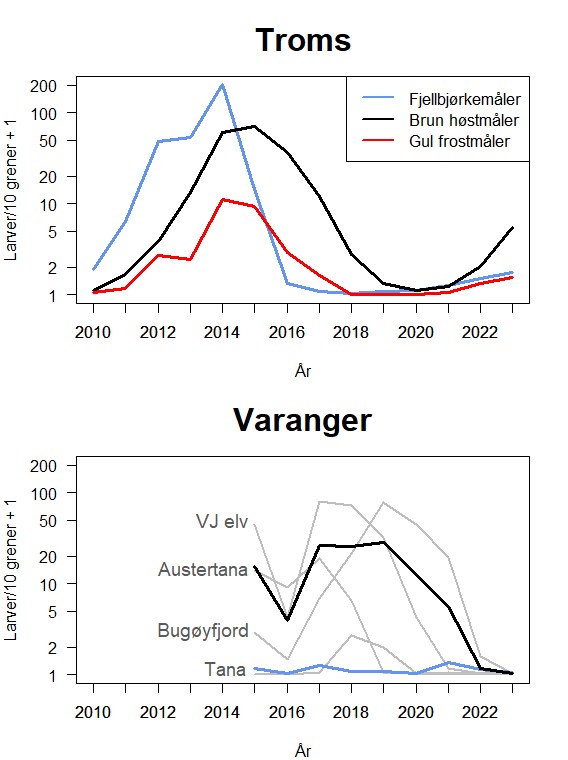 Gjennomsnittlig tetthet av målerlarver (antall larver per 10 grener) for COATs faste overvåkningslokaliteter i Varanger (4 lokaliteter, 40 stasjoner) og Troms (12 lokaliteter, 244 stasjoner). De grå linjene i panelet for Varanger viser gjennomsnittlig tetthet av brun høstmåler for hver av overvåkningslokalitetene i denne regionen. Merk at tidsseriene for Varanger starter først i 2015 og at gul frostmåler foreløpig ikke er registrert i denne regionen.