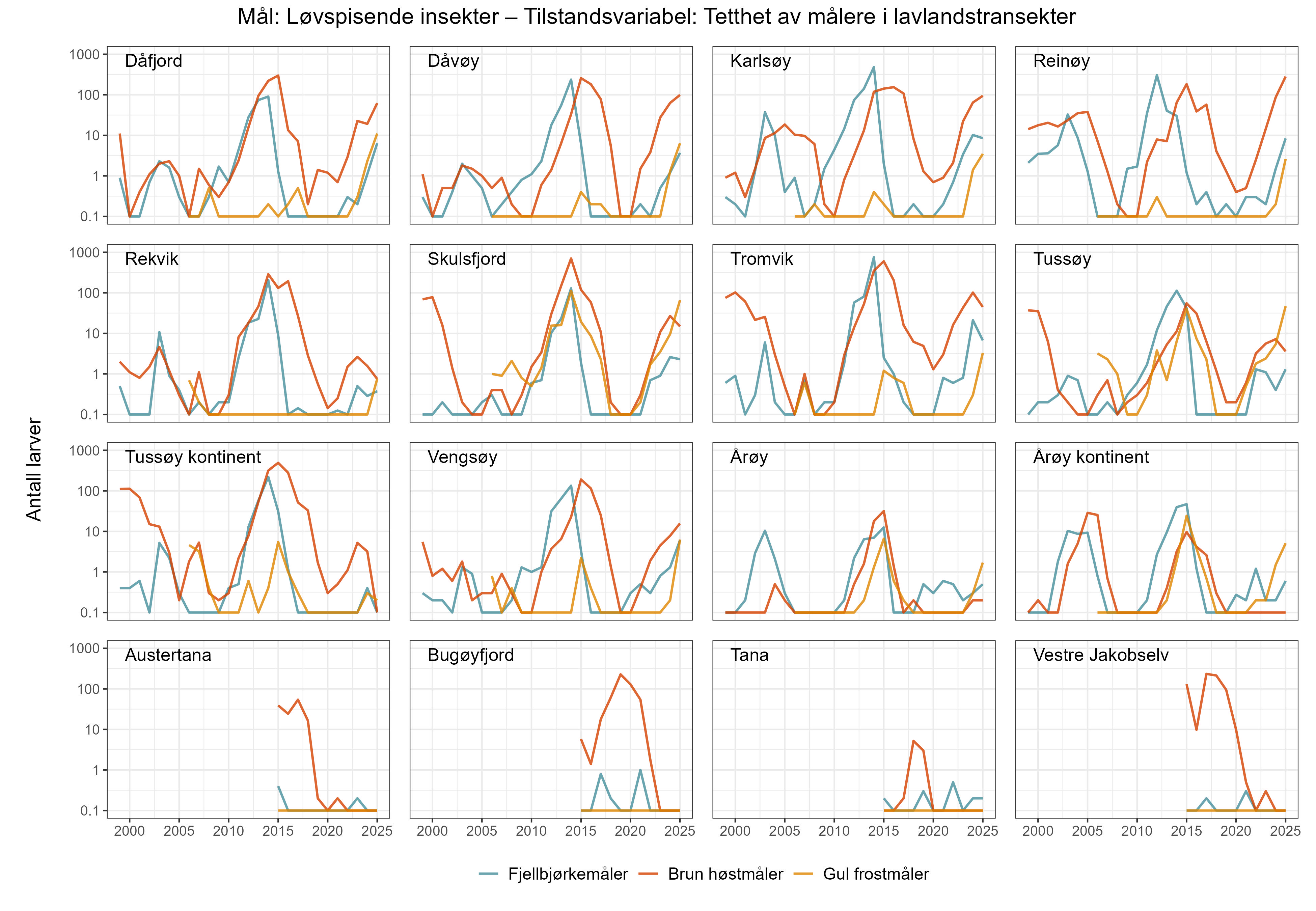 Tetthet av målerlarver i lavlandstransekter i Troms (øvre tre rader) og Øst-Finnmark (nederste rad). Linjene viser gjennomsnittlig tetthet (antall larver per stasjon). Utbrudd av bjørkemålere forekommer omtrent hvert tiende år. I Troms har overvåking av bjørkemålere pågått siden 1999. Overvåkingen i Øst-Finnmark ble påbegynt i 2015. Mer informasjon om studiedesign og datasett.