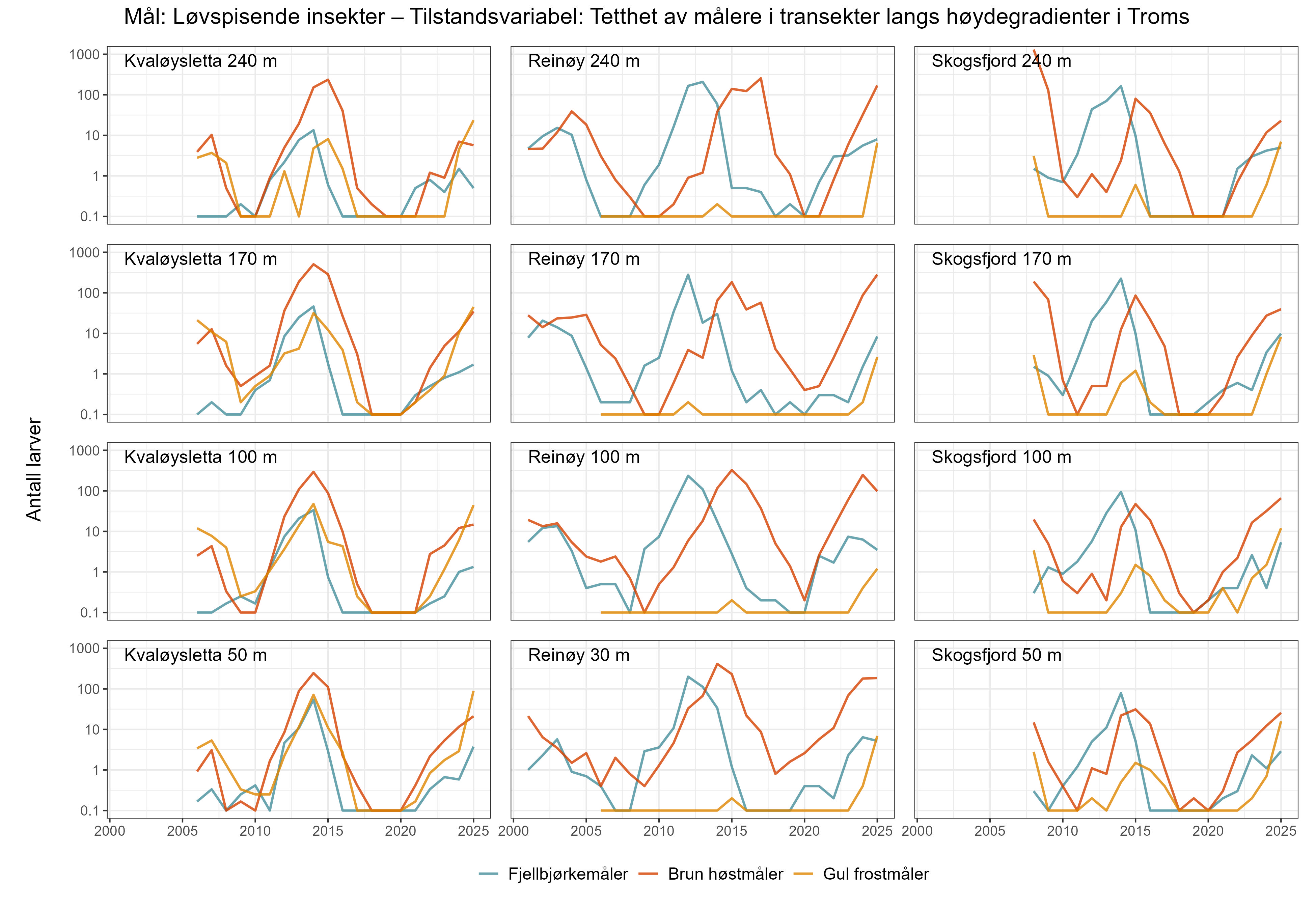 Tetthet av målerlarver i transekter langs høydegradienter i Troms. Linjene viser gjennomsnittlig tetthet (antall larver per stasjon). Utbrudd av bjørkemålere forekommer omtrent hvert tiende år. I Troms har overvåking av bjørkemålere pågått siden 1999. Mer informasjon om studiedesign og datasett.