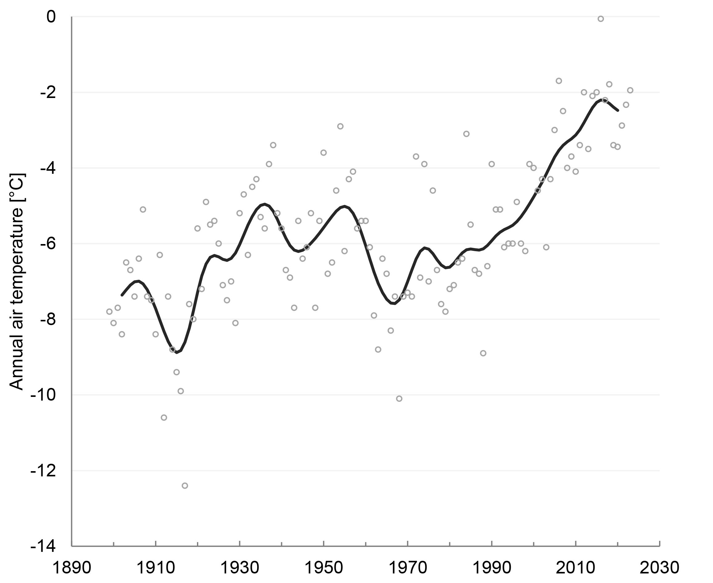 Figure 1. Annual mean air temperature at Svalbard Airport. The thick bold line is filtered data and shows long-term variability at a decadal scale.