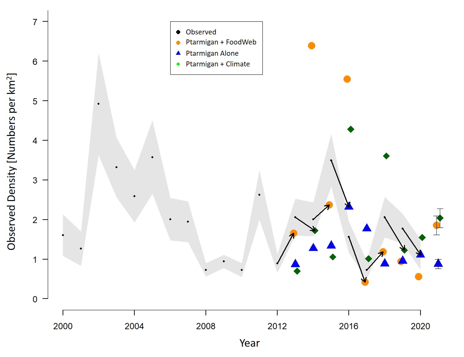 Figure 2. COAT's predictions of this year's observed ptarmigan densities (numbers seen / km2) one and a half months before the line-transect surveys were made. This year's predictions are given with confidence intervals that indicate the uncertainty surrounding the estimate. The colored symbols show the predictions from three alternative statistical models that vary in assumed influencing factors and complexity - of which the food web model (orange dots) is the most complicated (see Figure 1). The observed ptarmigan densities up to the year 2020 are shown as small black dots in a curve where the gray field denote the margin of uncertainty. The arrows point to the model with predictions that is closest to the observed values ??for each year's prediction.