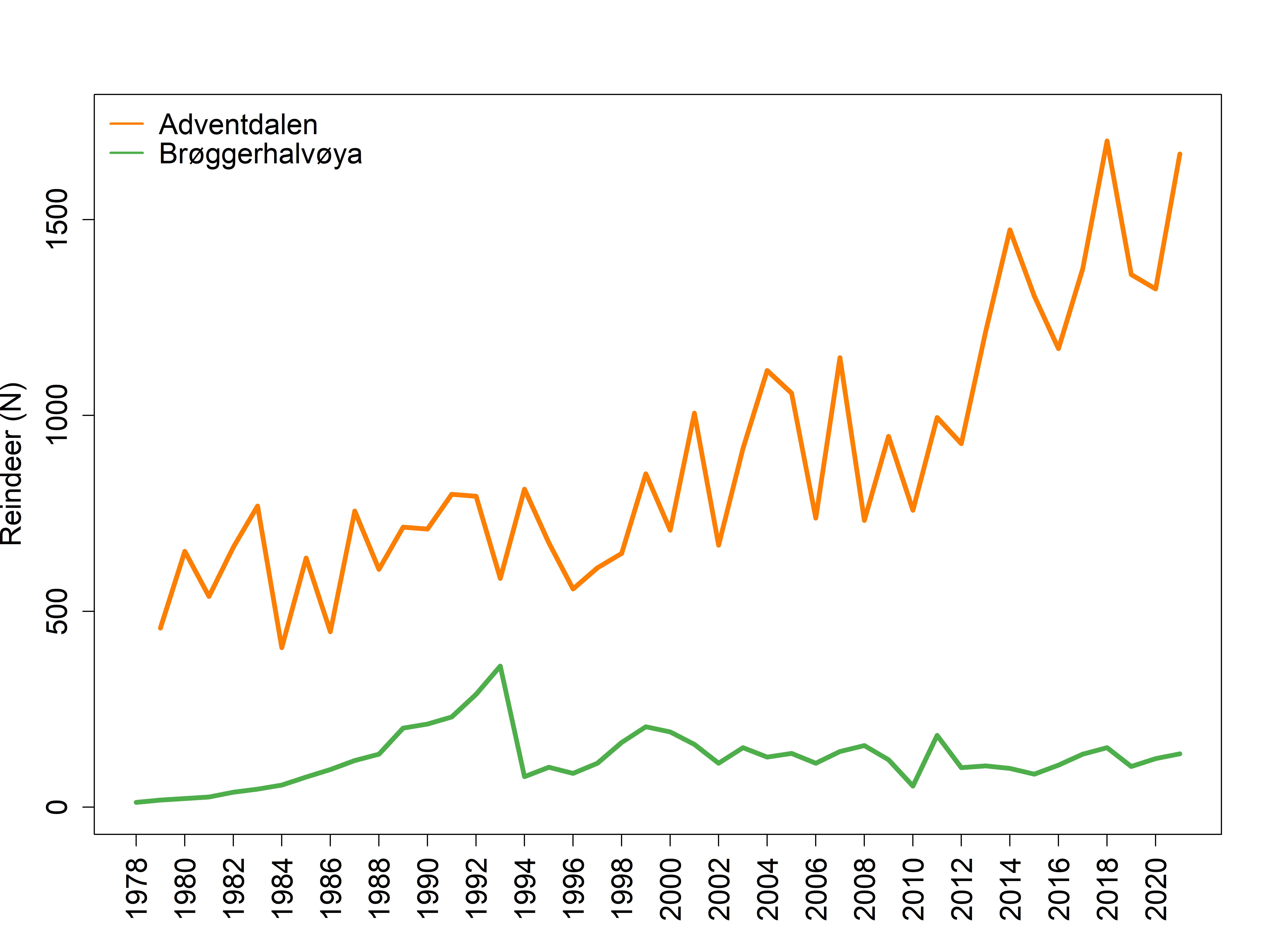 Population abundance of Svalbard reindeer in the valley of Adventdalen (summer counts 1979-2021) and from the coastal Brøgger Peninsula (winter counts 1978-2021).